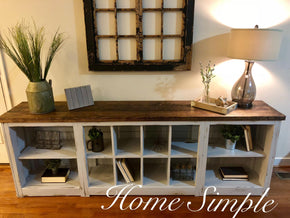 The Modern Farmhouse Cube Cabinet measuring 96 "x 30" x 18". This piece is painted seagull grey and painted dark walnut. This is a custom made to order piece. Please Message to order. Please have size, style, and color when ordering.