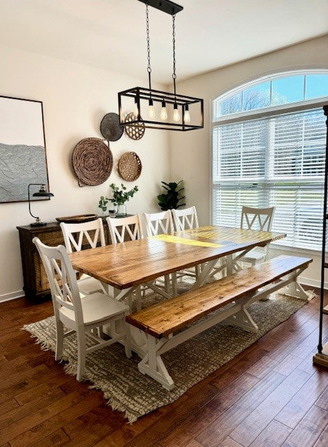 This table set includes one Truss Beam table, bench and chairs. This set is custom made to order. Please Message to order. Please have size, style, and color when ordering.